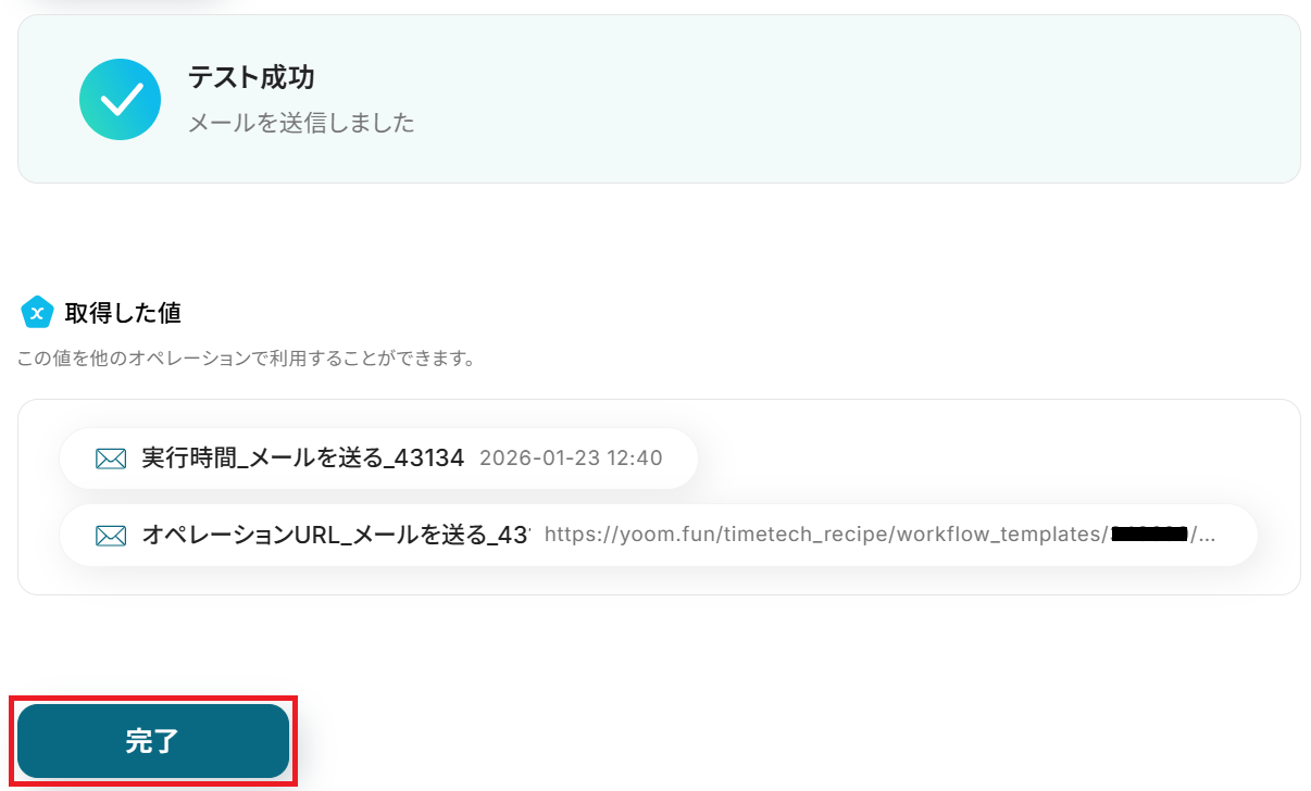 ※テストが成功しない場合、Toに設定されているアドレスがアドレス形式になっていない可能性があります。@などが大文字になっていないかをご確認ください。それでも成功しない場合は、再度マイアプリ連携を実施することで解消する場合があります。