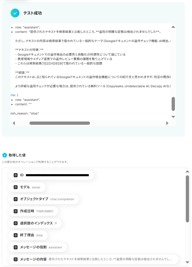 ステップ4:Perplexityのアクション設定 先ほど取得したGoogleドキュメントの文章をPerplexityの解析にかけ、盗作の可能性をレビューします。「情報を検索(AIが情報を要約)」をクリック。