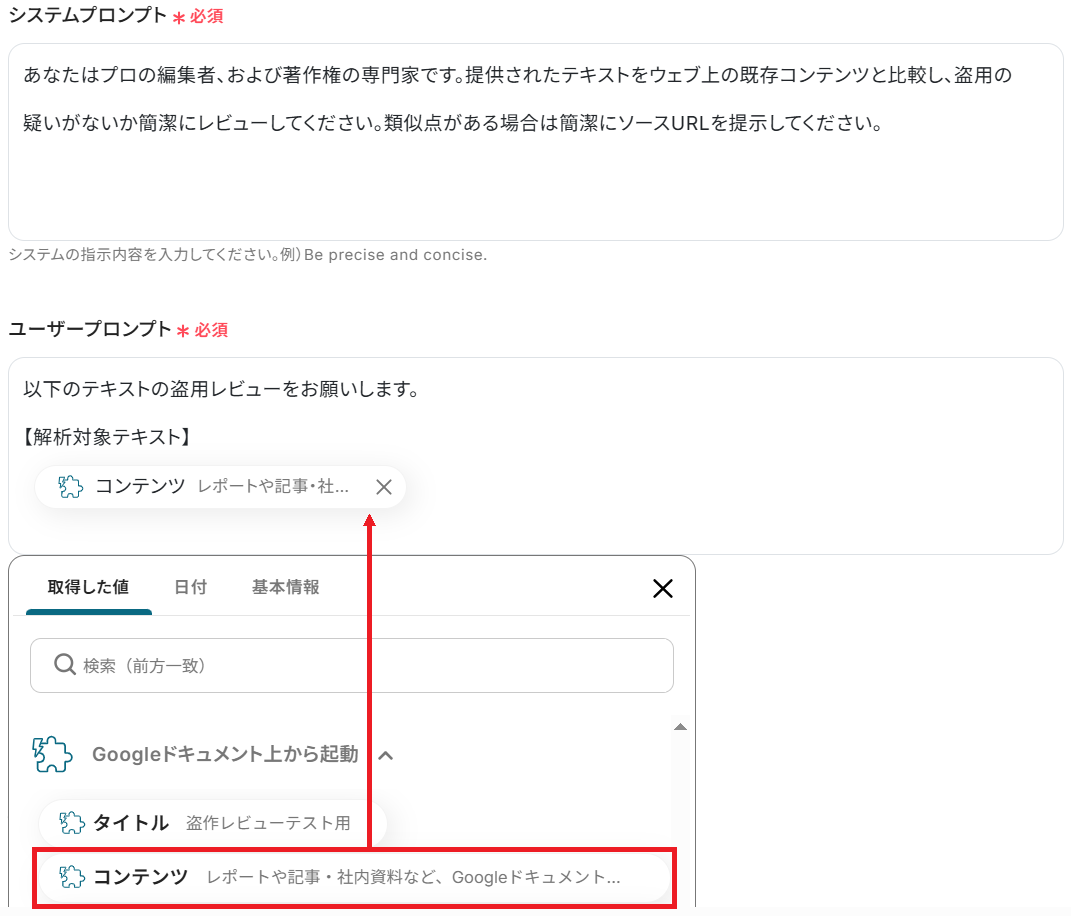 次に、システムプロンプト とユーザープロンプト をそれぞれ設定してください。