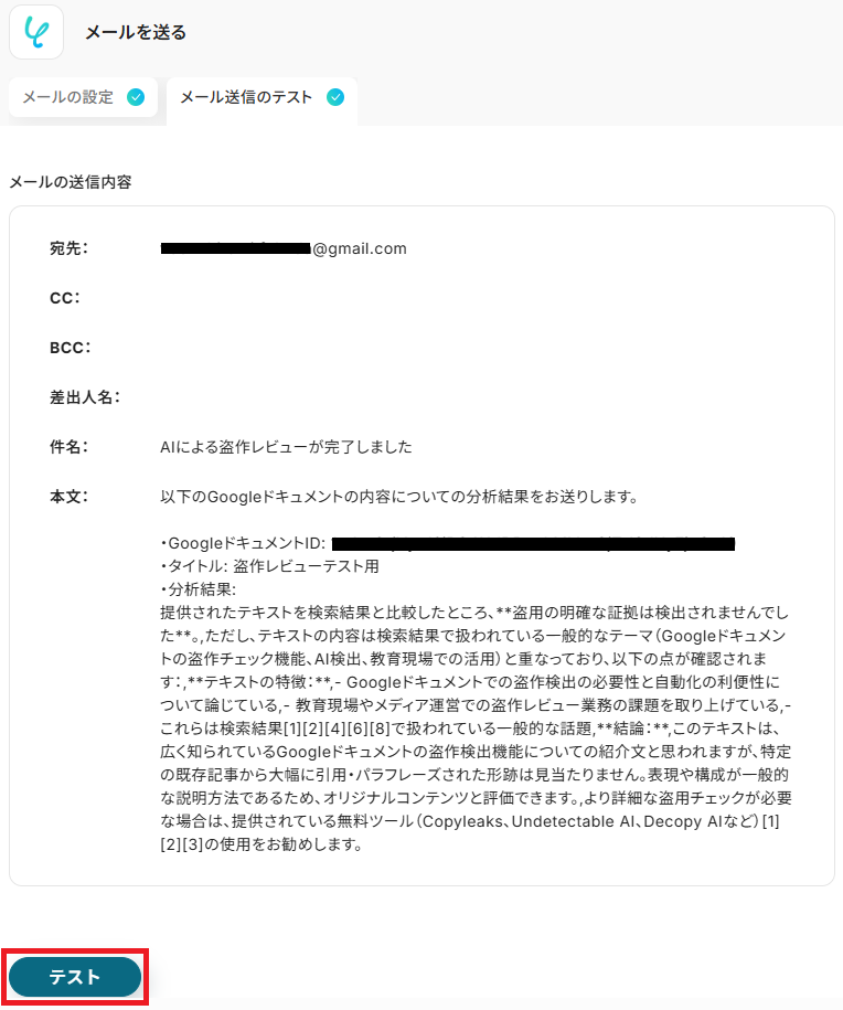 「次へ」をクリックするとメール送信のテスト画面に移るので、内容に誤りがないか確認してテストしましょう。