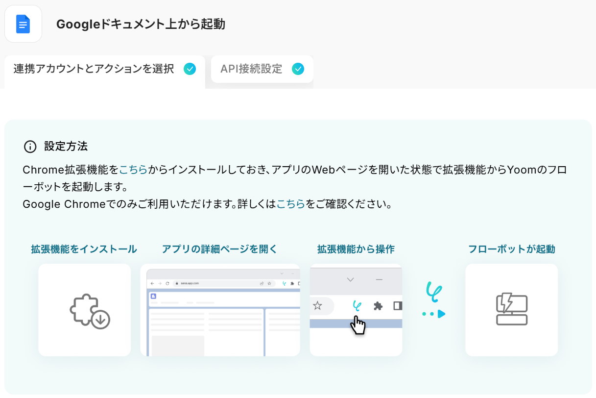 Googleドキュメント、Anthropic(Claude)、SlackのそれぞれとYoomを連携してください。 Chrome拡張機能を使ったトリガーの設定方法はこちら をご参照ください。