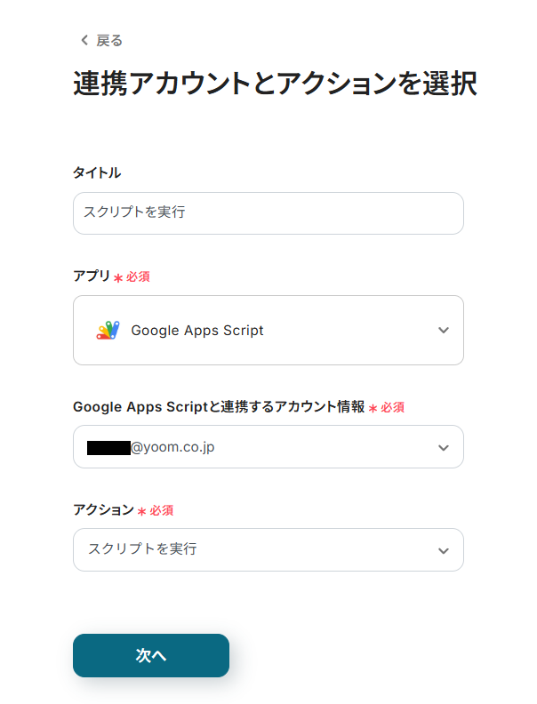 連携アカウントとアクションを確認し、「次へ」をクリック。
