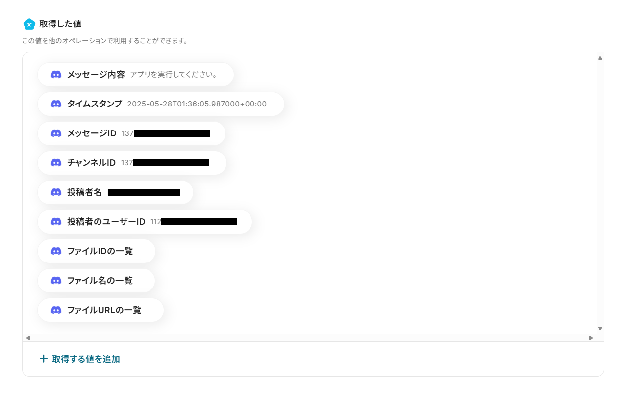 テストに成功すると、「取得した値」に最新メッセージの情報が追加されます。 これらの値は、以降のアクションで変数(フローが稼働する度に変わる値)として使用できるようになります。 詳しい説明は、こちらのヘルプページ をご覧ください。