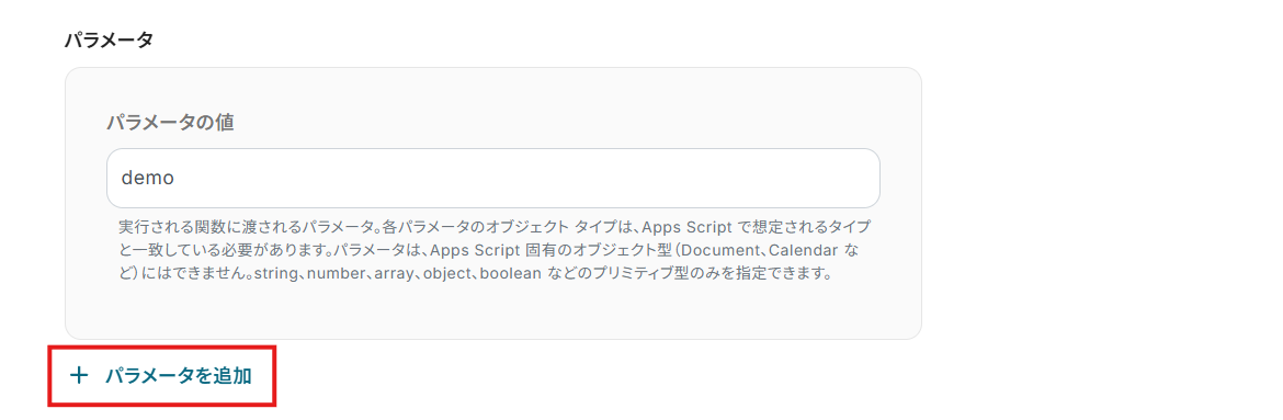 関数に渡すパラメーターを「パラメーターの値」に設定。 「パラメーターを追加」をクリックすることで、複数のパラメーターを設定できます。