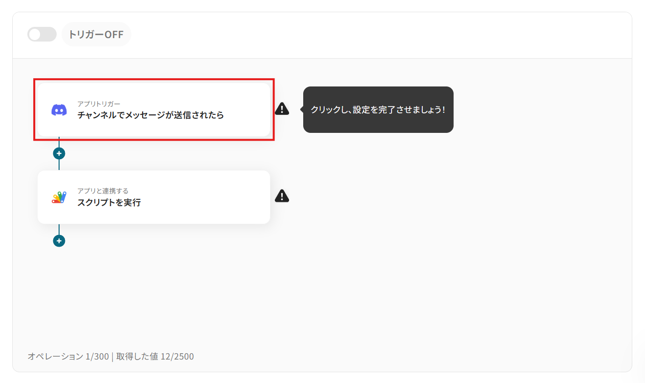 Discordのトリガー設定では、メッセージの受信を検知するチャンネルを任意で設定してください。 Google Apps Scriptのオペレーション設定では、実行するスクリプトに渡す任意のパラメータを指定することが可能です。 ■注意事項