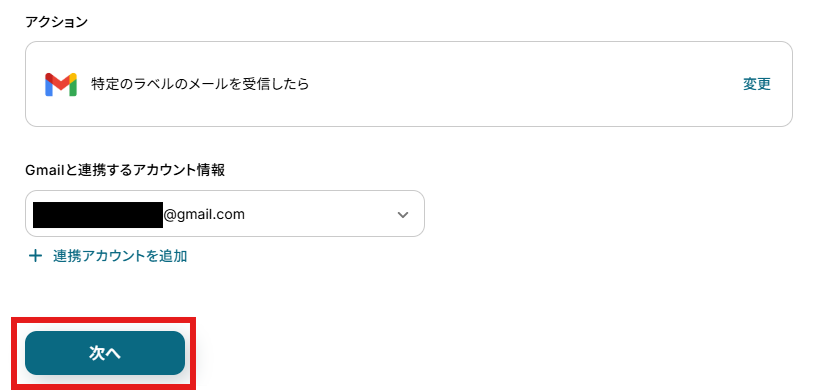 アクションはデフォルト設定のまま、アカウント情報は、連携したいアカウントが選択されているか確認してください。確認が終わったら「次へ」で進みましょう。