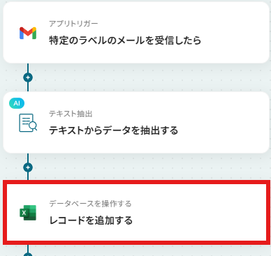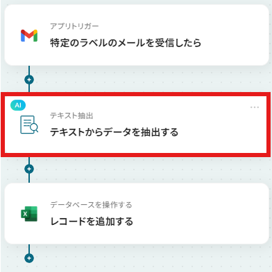 - 次に、オペレーションでAI機能を選択し、「テキストからデータを抽出する」アクションでメール本文から必要な情報を抽出します。