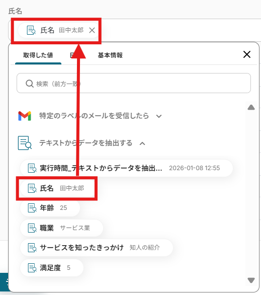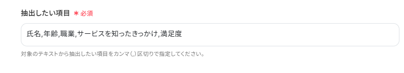 - AI機能の設定では、受信したメール本文のどのテキストを対象に、どの項目(氏名、回答内容など)を抽出するかを具体的に指定できます。