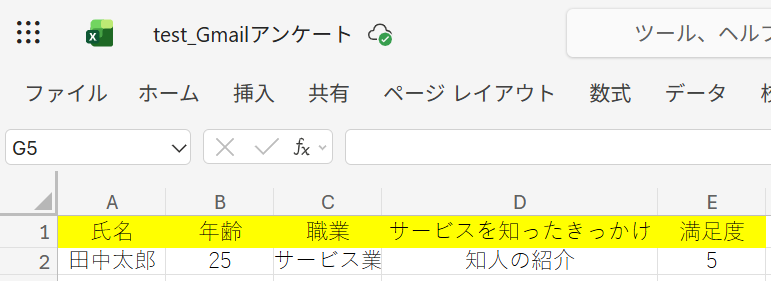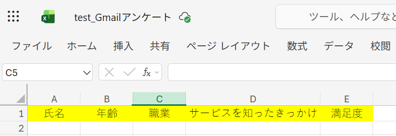 Gmailで受信した情報を保存するため、今回は以下のようなシートをMicrosoft Excel上で作成しました。
