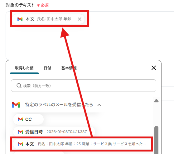 「対象のテキスト」は前ステップで取得した値から、「本文」を選択してください。