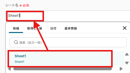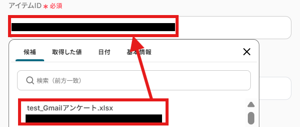 「アイテムID」も候補に該当のシートが表示されますので、そちらから選択してください。