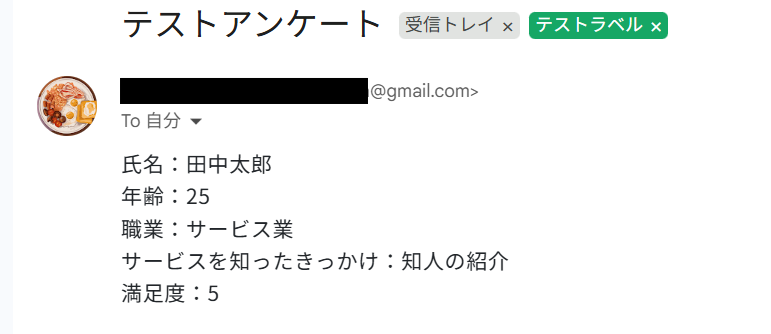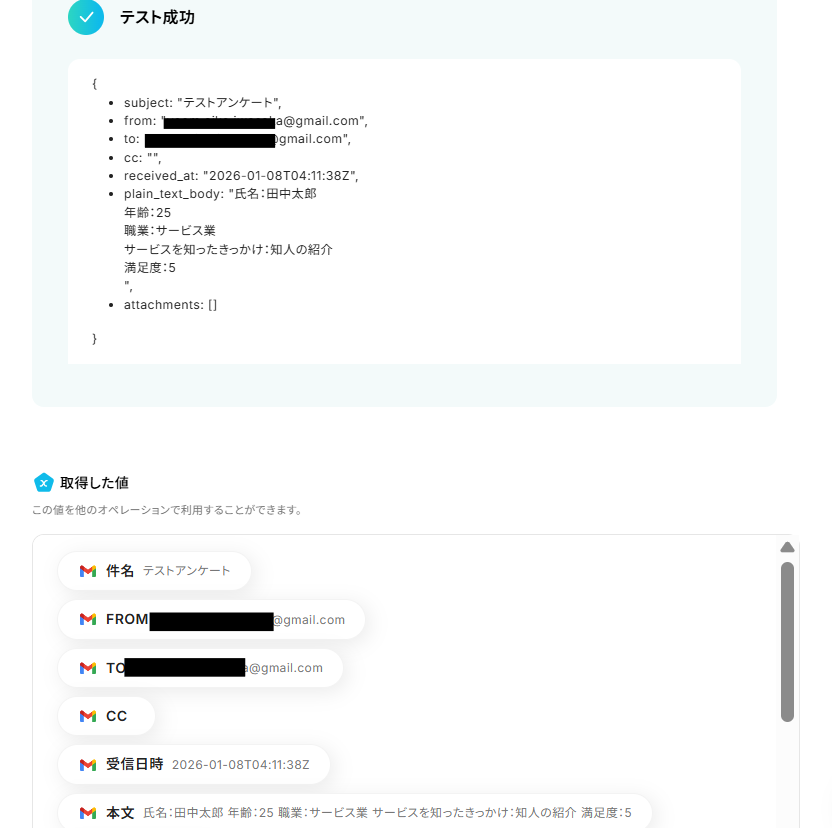 テストが成功し、メールの情報が取得した値に入ればOKです。