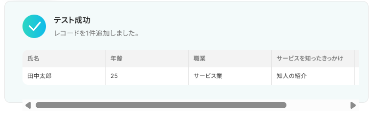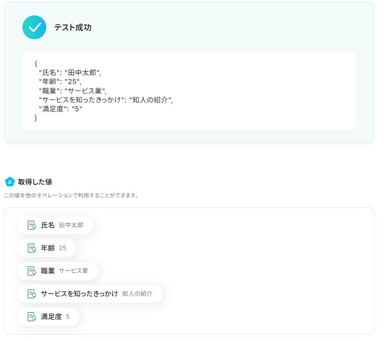 テストが成功し、取得した値に「抽出したい項目」と「その値」が入ればOKです。