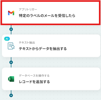 - 次に、トリガーでGmailを選択し、「特定のラベルのメールを受信したら」というアクションを設定します。