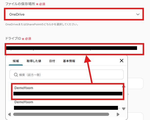 ドライブIDは候補に表示されますので、そちらから選択を行いましょう。