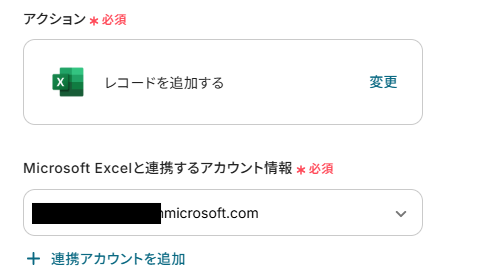 アクションはデフォルト設定のまま、アカウント情報は、連携したいアカウントが選択されているか確認してください。
