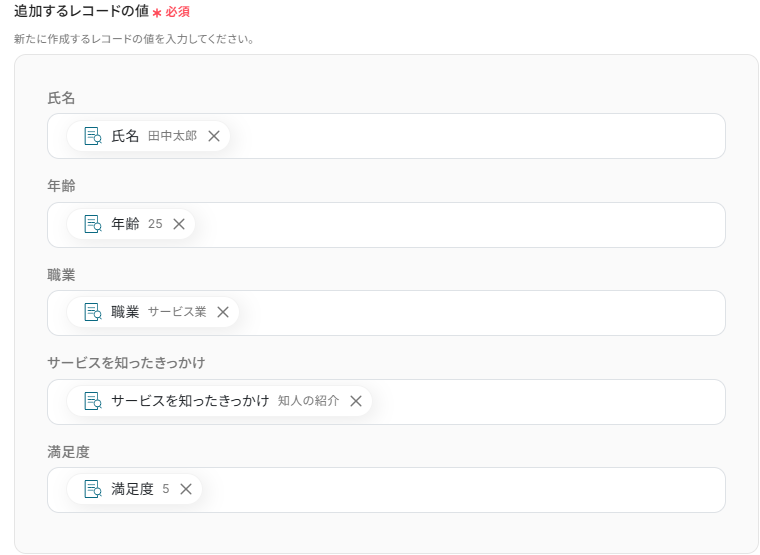- 本文や件名には、Airtableから取得した顧客名や金額といった情報を変数として埋め込んだり、定型文などの固定値を設定したりすることが可能です。