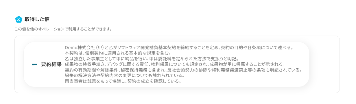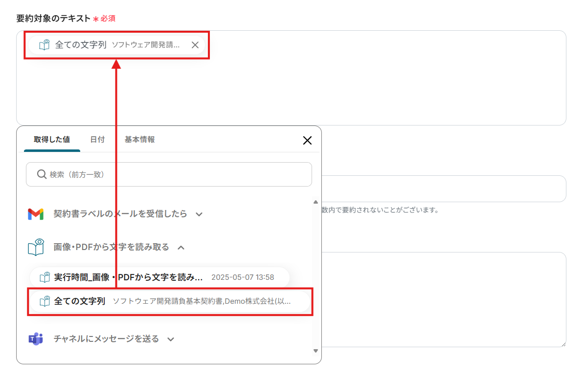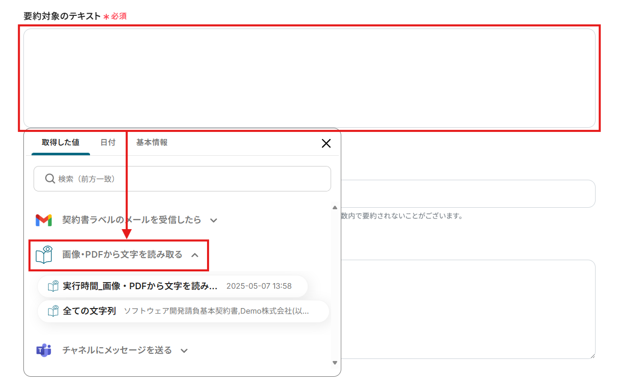 Gmailで受信したメールに添付されたPDFファイルを自動で抽出し、その内容をOCR(光学的文字認識)技術でテキストデータ化、さらにAIが内容を要約してMicrosoft Teamsの指定チャンネルに通知・保存する連携フローです。