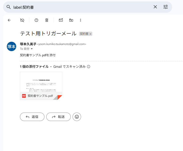 - テスト用に、前準備で用意したPDFファイルを添付したメールを、連携しているGmailアカウントに送信します。
