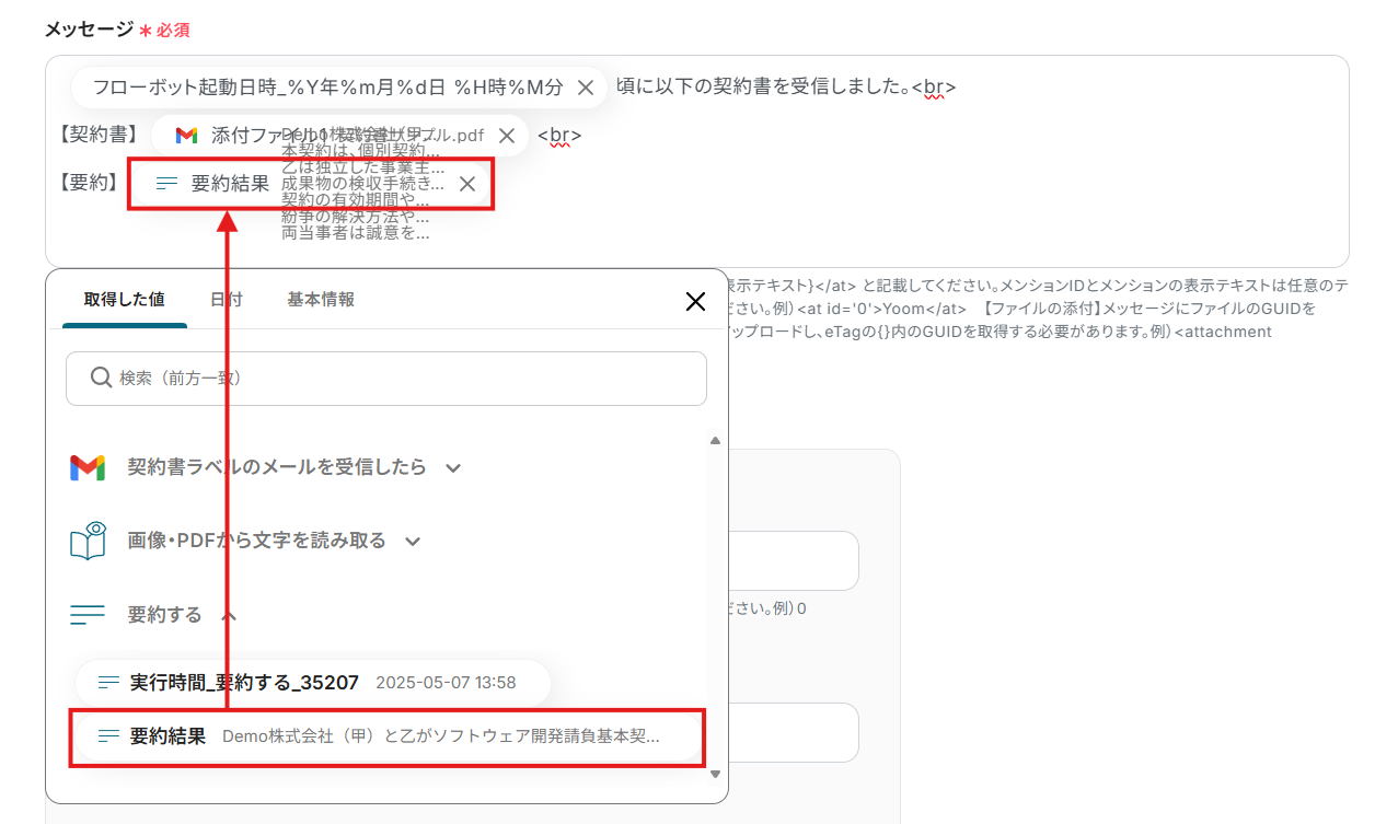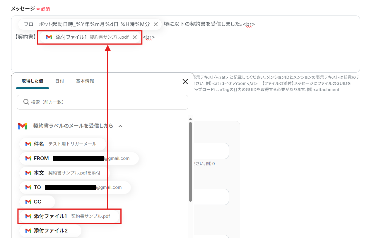 入力欄クリック時に表示される「取得した値」タブから、各アクションで取得した値が選択可能です。