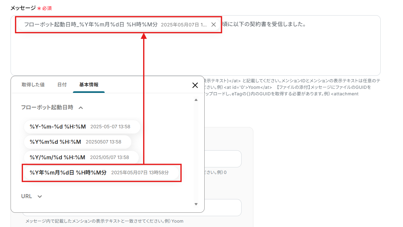 「日付」タブからは任意の形式の日付情報が、「基本情報」タブからはフローボットの起動時間などが追加できます。