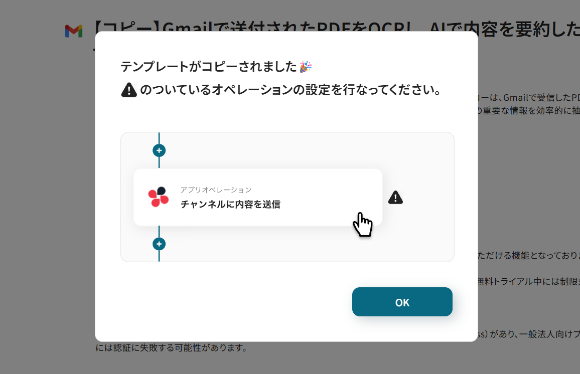 「Gmailで送信された特定のメールに添付されているPDFをOCRし、Microsoft Teamsに保存する」ワークフローは、Gmailで受信した特定のメールに添付されたPDFファイルをOCRで読み取り、その後、Microsoft Teamsに自動で保存する仕組みです。これにより、PDFの内容を迅速に処理し、チームメンバーと効率的に共有できます。