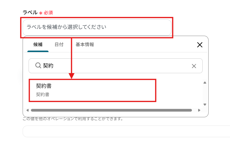 入力欄をクリックすると、連携しているGmailアカウントのラベルから候補が表示されますので、対象となるラベルを選択してください。