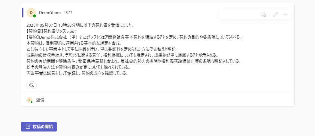 Gmailにメールを送信し、添付ファイルの要約がMicrosoft Teamsに投稿されていれば成功です。