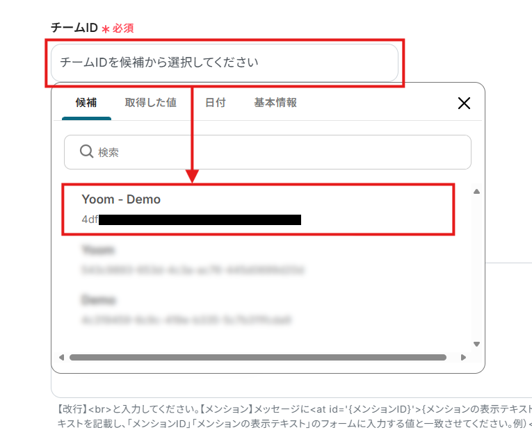入力欄をクリックすると、連携しているMicrosoft Teamsアカウントのチームから候補が表示されるため、対象となるチームを選択してください。
