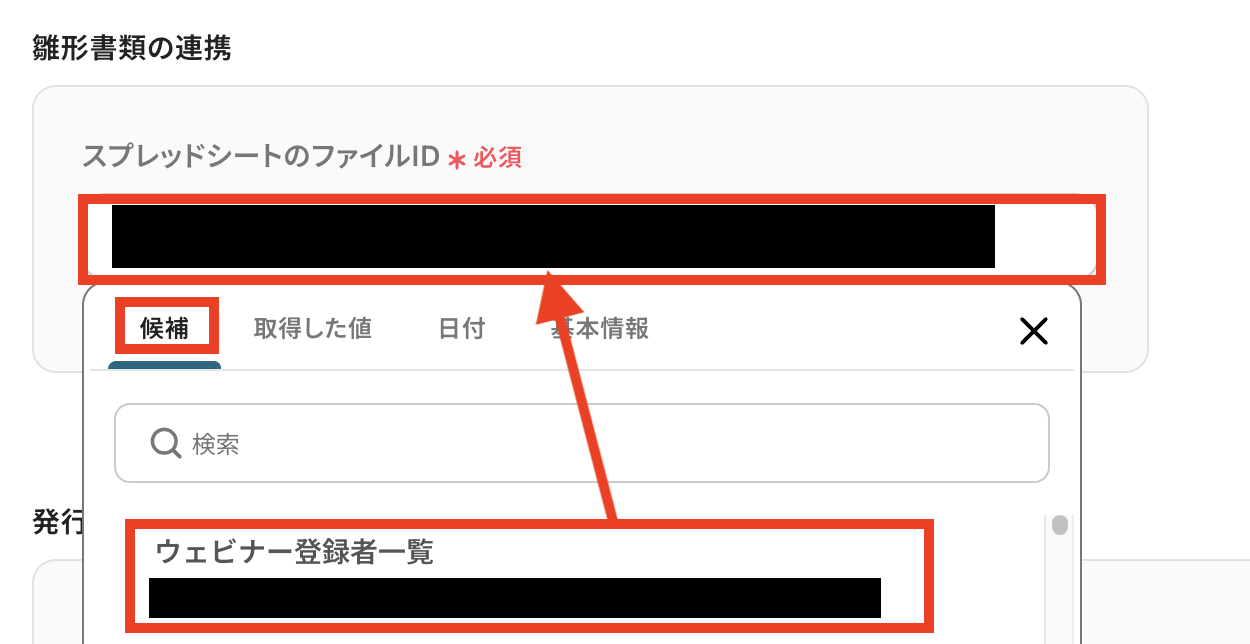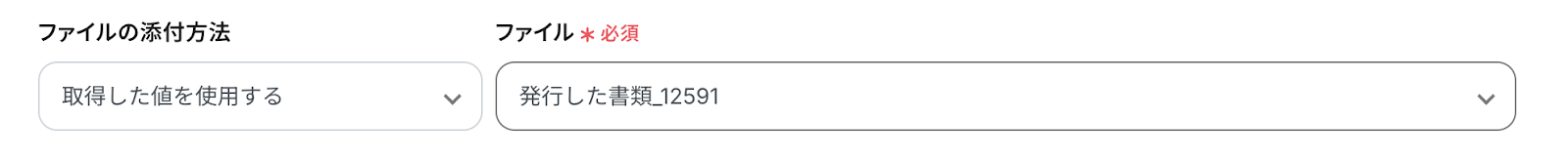 「ファイルの添付方法」は「取得した値を使用する」を選択すると「発行した書類」を選べます。