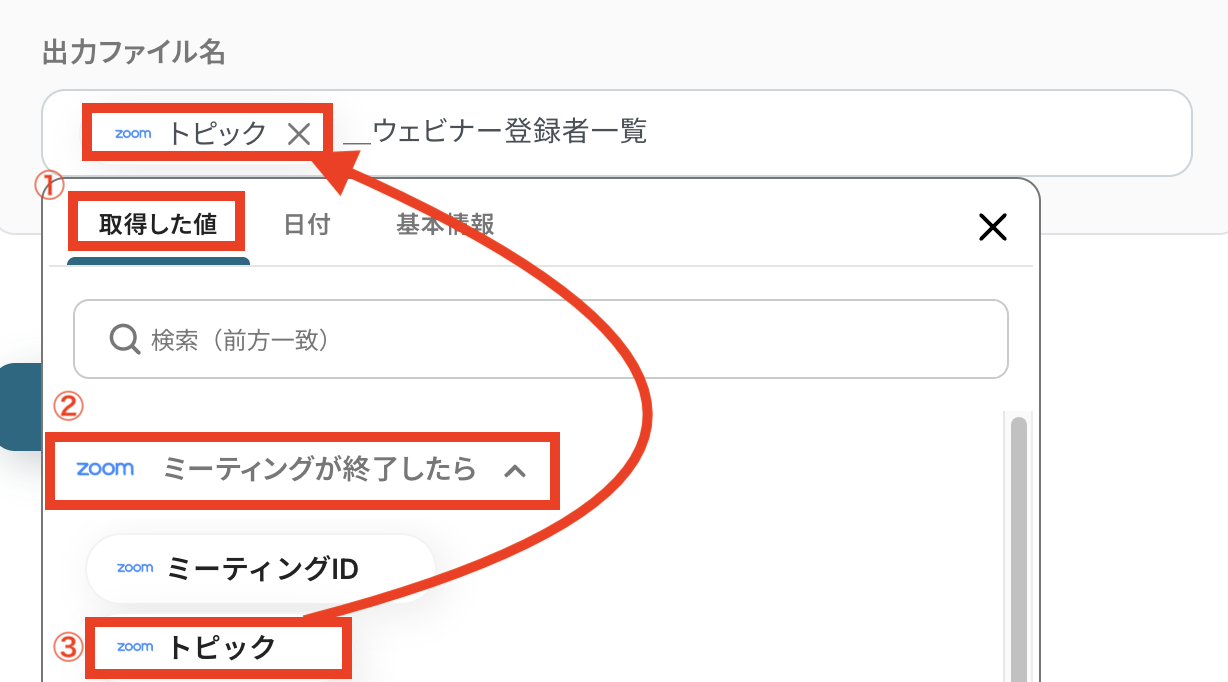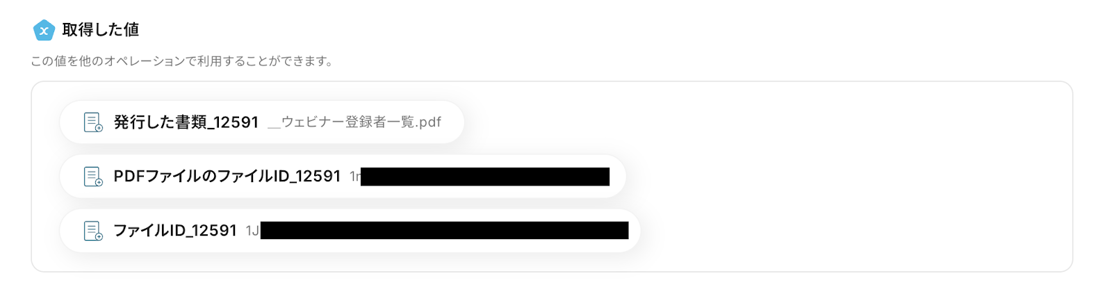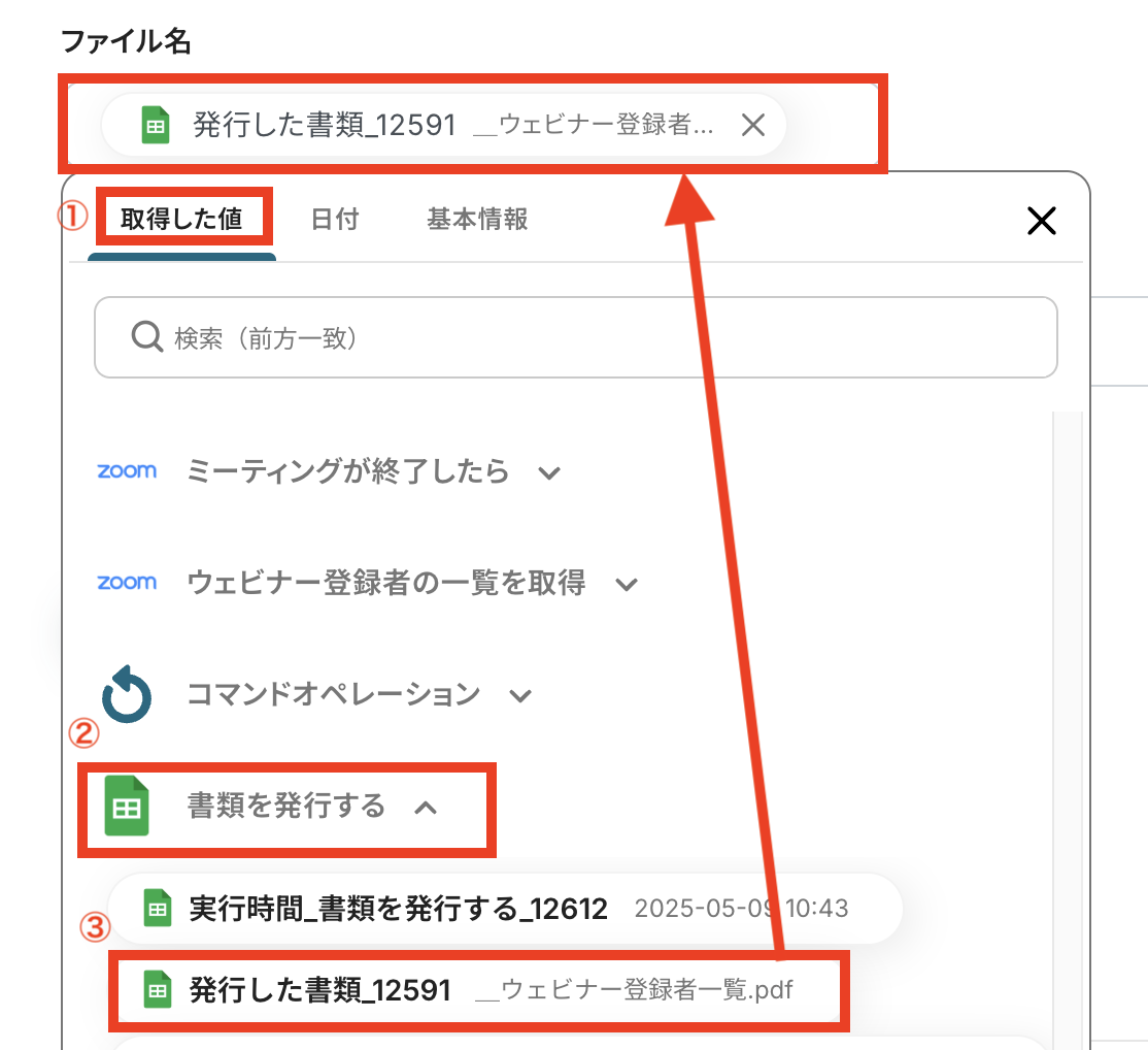 「ファイル名」はステップ6で取得した値を活用することで、ファイル名が他の書類と被るのを防げます!