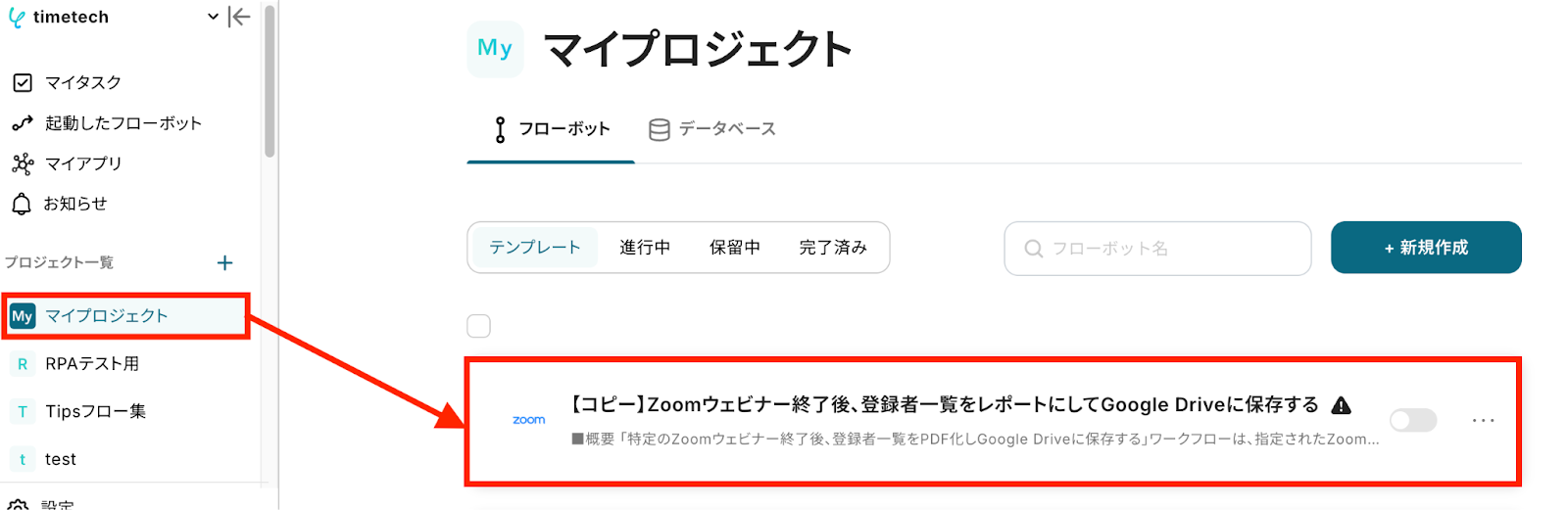 左側にあるメニューの「マイプロジェクト」から、コピーしたテンプレートを開きます。