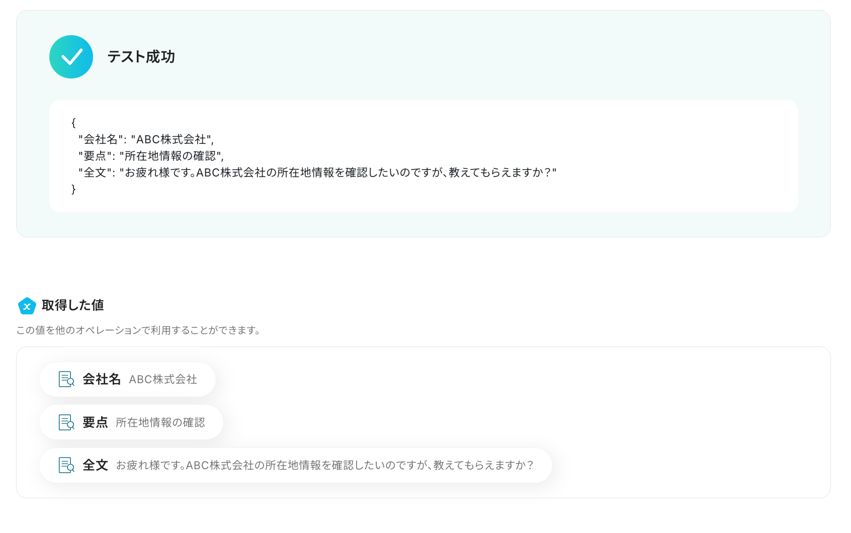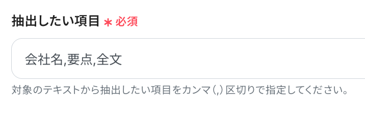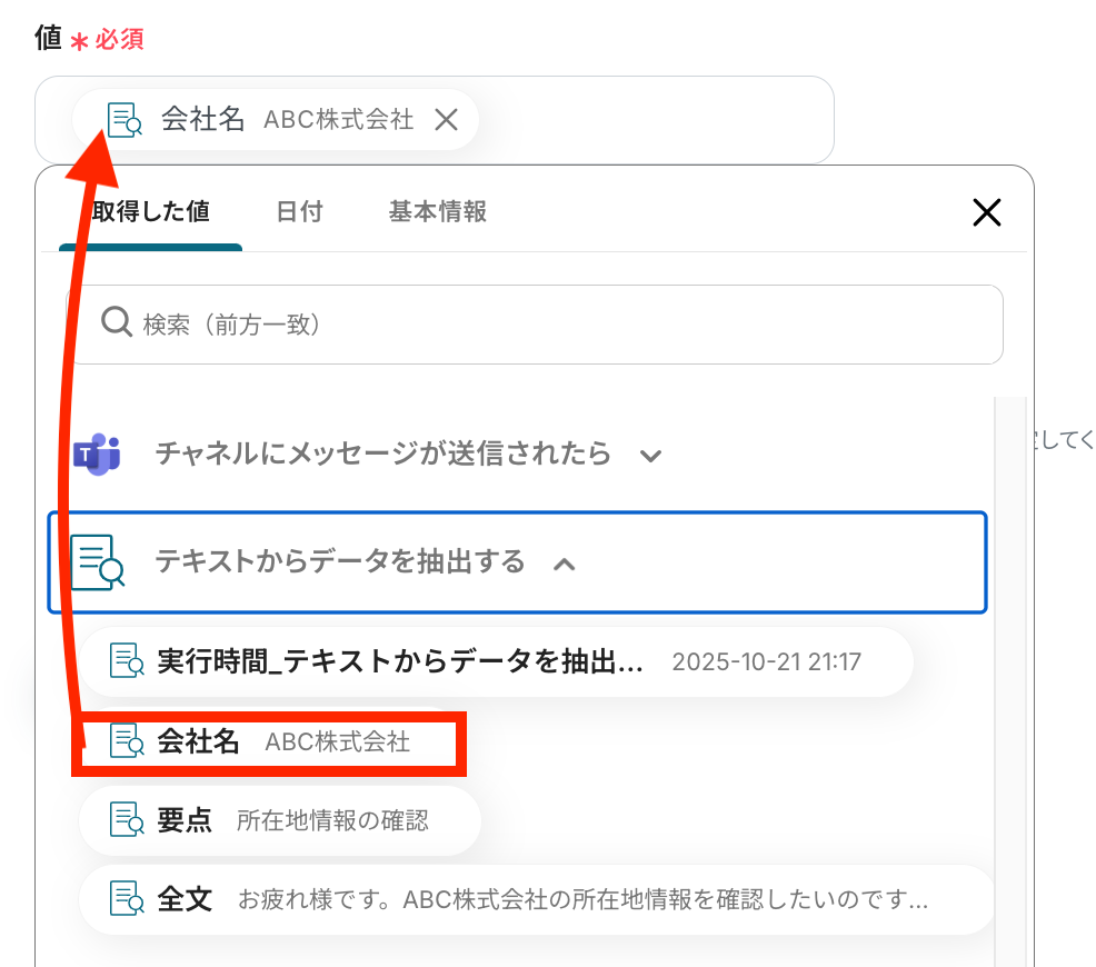 値は、テキストからデータを抽出した際に取得したアウトプットを選択しましょう。