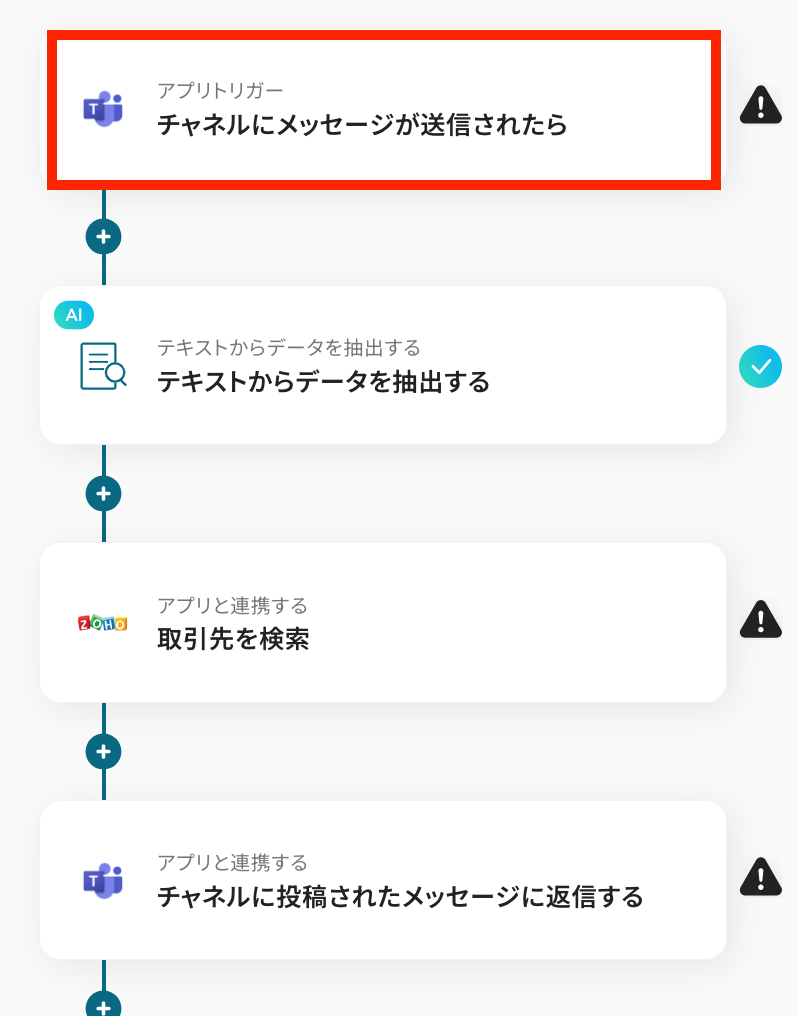 それでは代表的な例として、Microsoft Teamsの特定のチャネルへの投稿をもとに、Zoho CRMの取引先を検索し、その結果をスレッドに返信するフローを解説していきます!