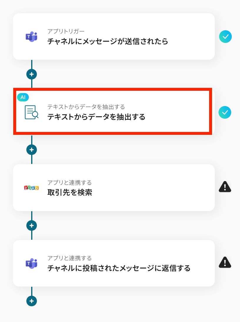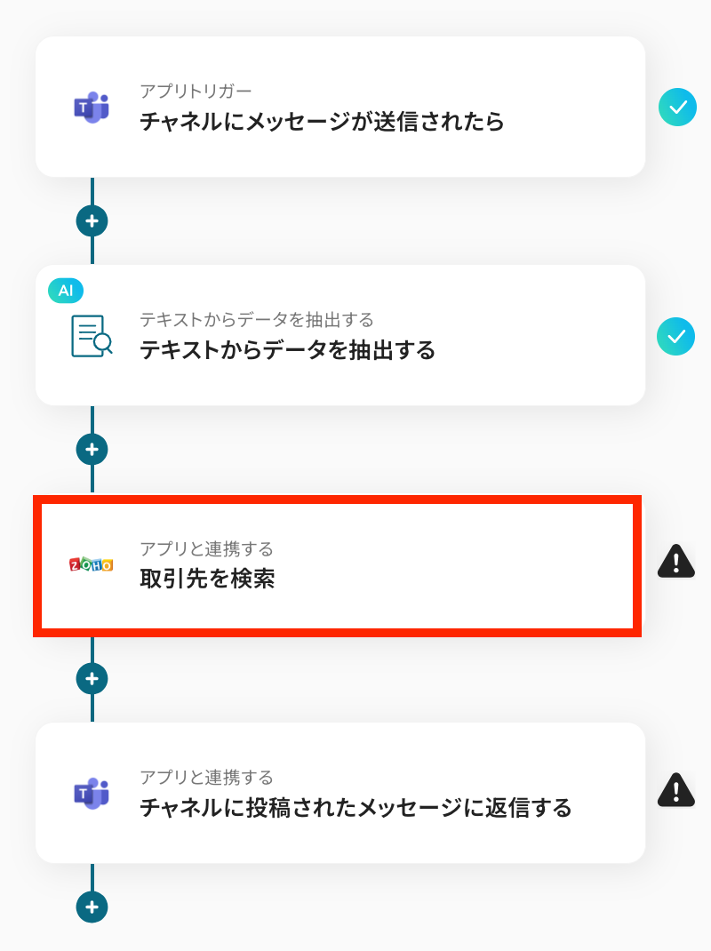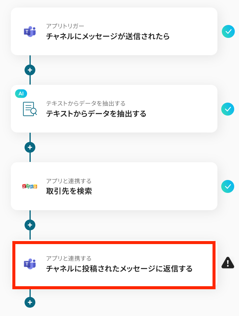 このワークフローを活用すれば、Microsoft Teamsへの投稿内容をもとにZoho CRMの取引先情報を自動で検索し、結果をチャネルに返信できます。