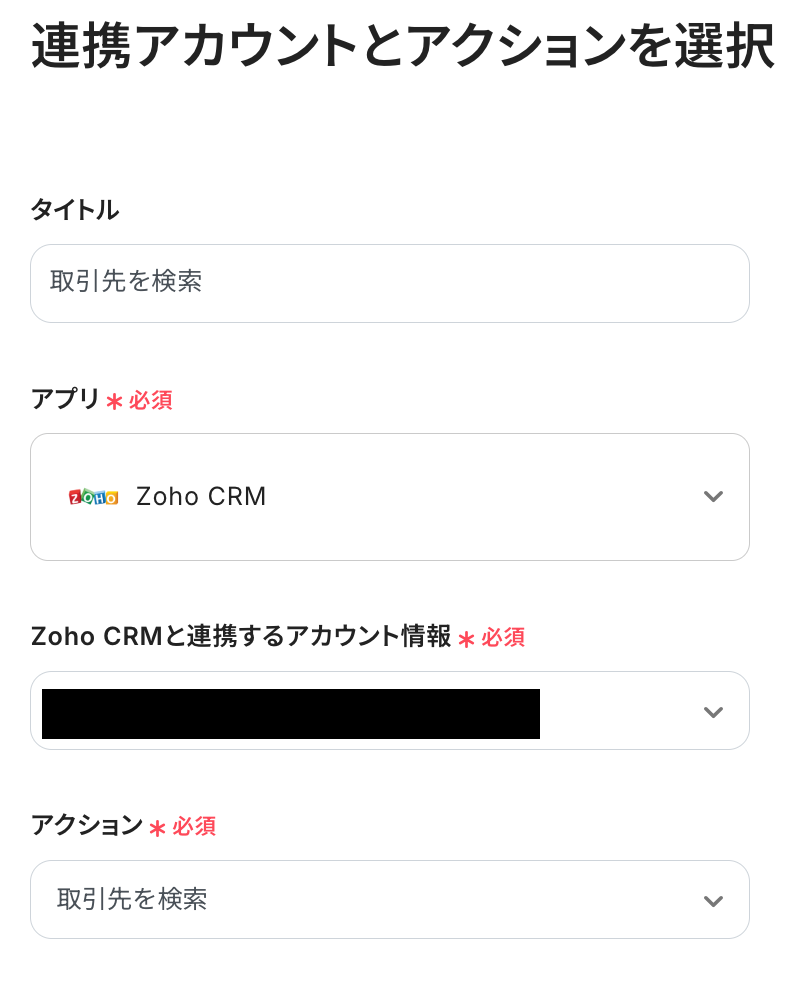 タイトルと連携するアカウント情報を任意で設定し、アクションはテンプレート通りに「取引先情報を取得」のまま「次へ」をクリックして進んでください。