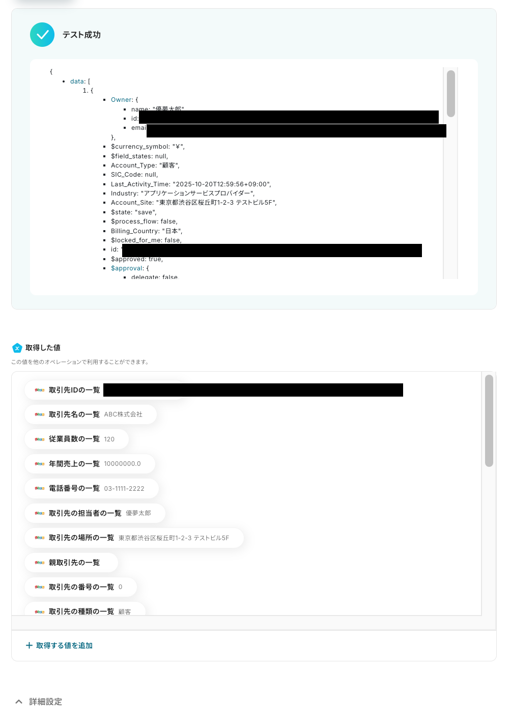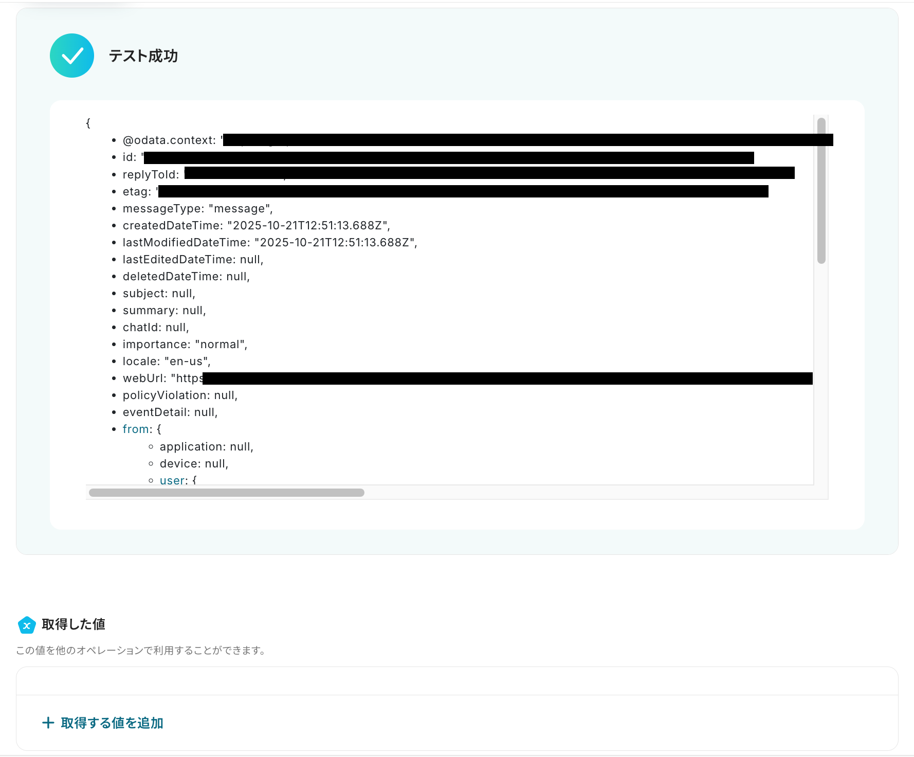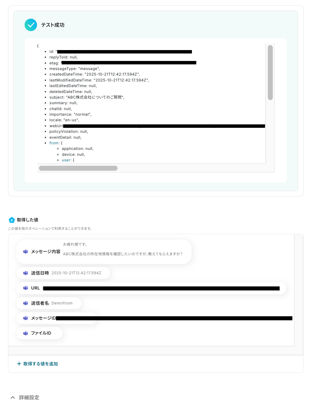 テストが成功すると、テスト成功画面と取得した値が表示され、Microsoft Teamsのデータが確認できます。