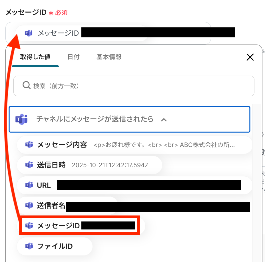 次の「メッセージID」は、アウトプットから以下のように入力します。