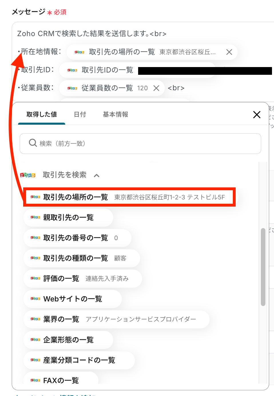 「メッセージ」も同様に、前ステップから取得したアウトプットを引用して設定できます。