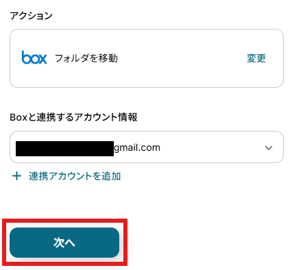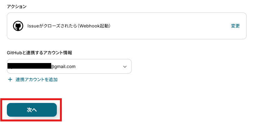 アクションはデフォルト設定のまま、アカウント情報は、連携したいアカウントが選択されているか確認してください。確認出来たら「次へ」をクリックしましょう。