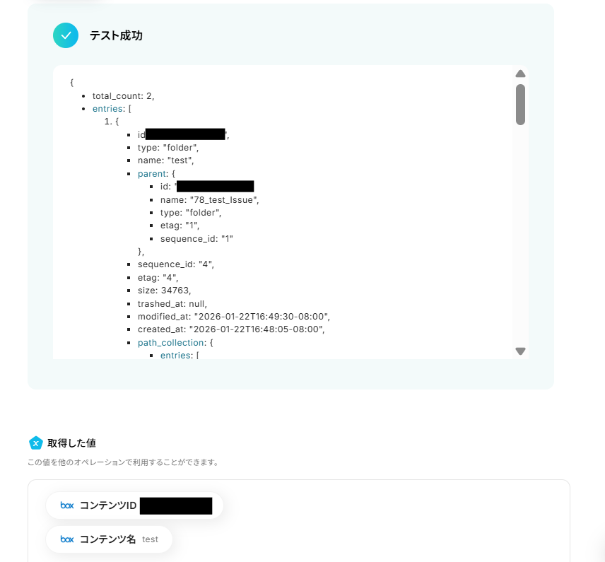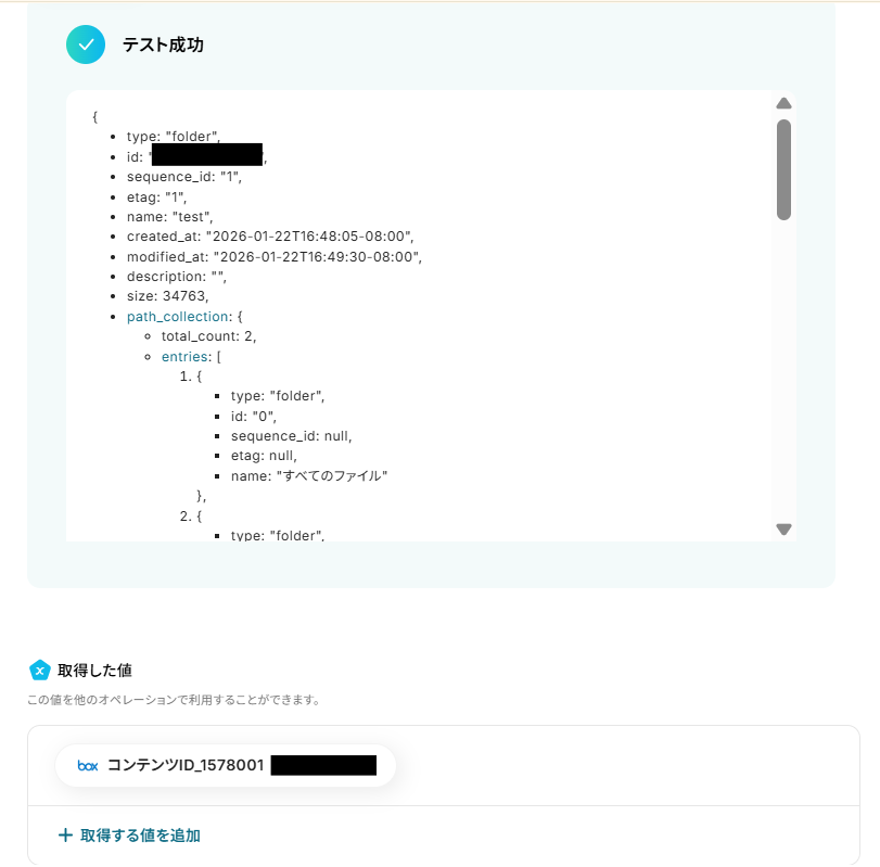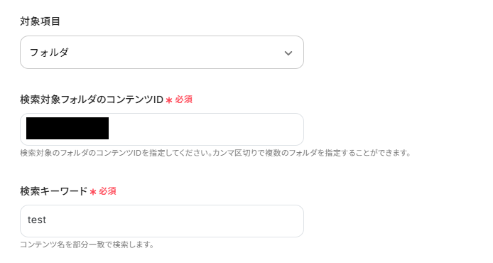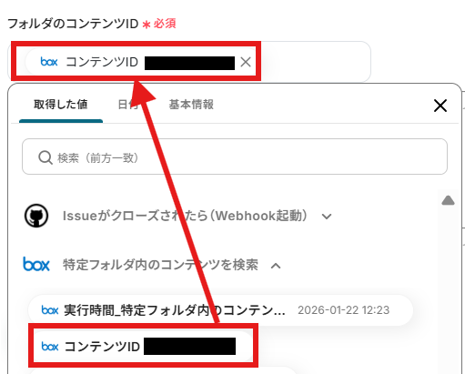 フォルダのコンテンツIDを、前ステップで取得した値より入力します。