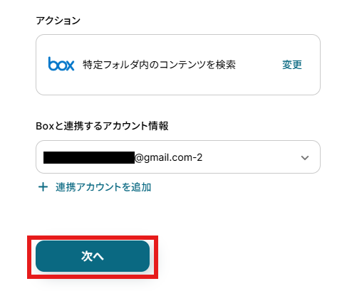 - 続いて、オペレーションでBoxを選択し、「特定フォルダ内のコンテンツを検索」アクションで、クローズされたIssueに関連するフォルダを検索するように設定します