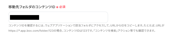 検索対象フォルダのコンテンツIDは、Boxの対象フォルダのURL末尾に記載されていますので、そちらを入力してください。