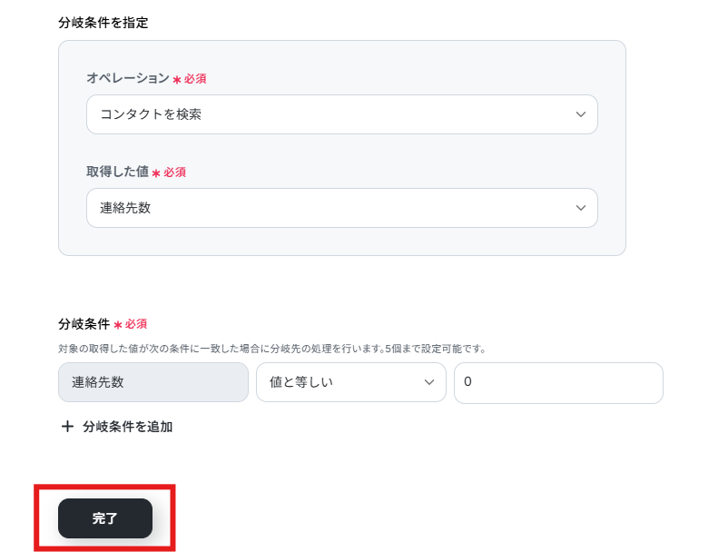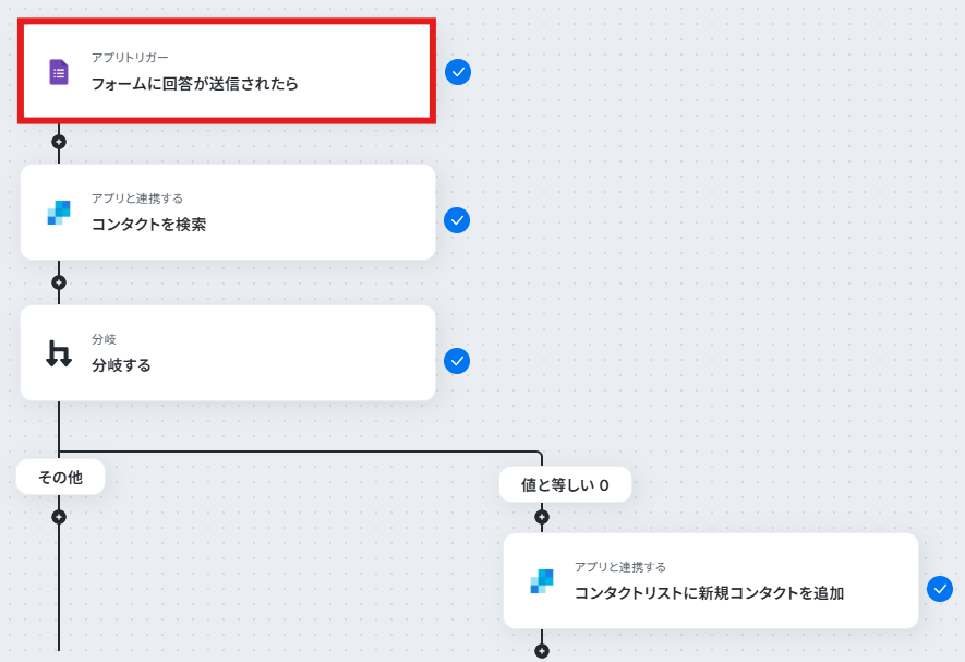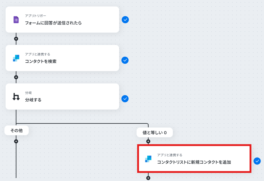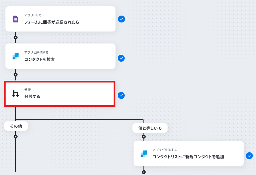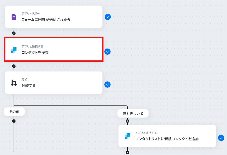 - 次に、分岐機能を追加し、コンタクトの検索結果が存在しない場合のみ、次の処理に進むよう条件を設定します。