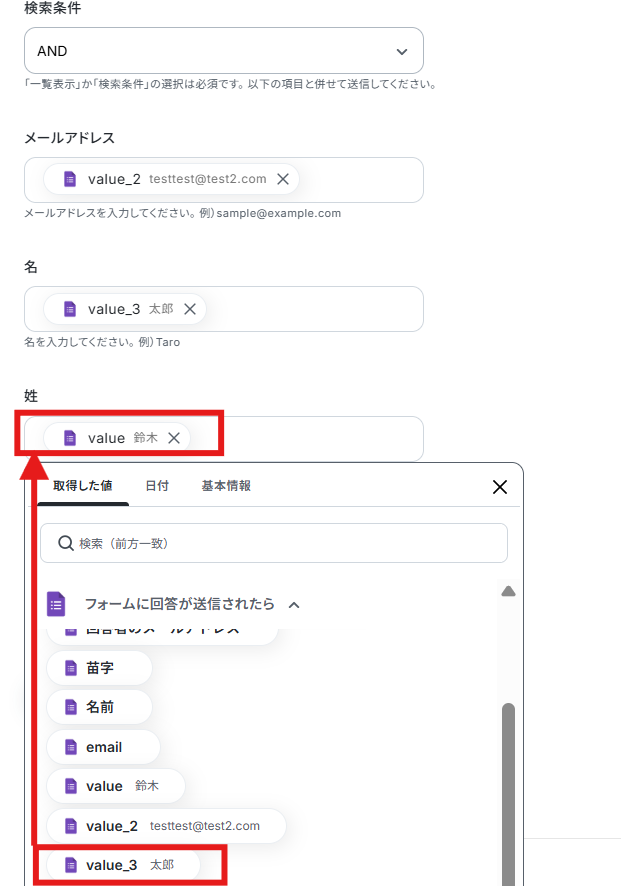 「検索条件」はAND、「メールアドレス」「名」「姓」は前ステップで取得した値から当てはまるものを入力していきます。