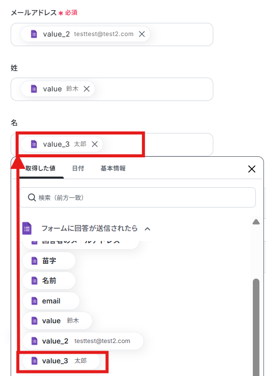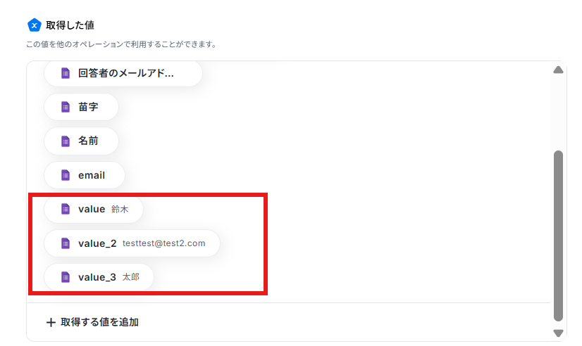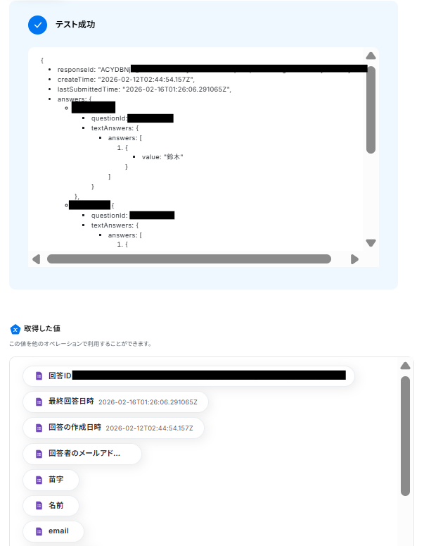 入力ができたら「テスト」ボタンを押してみましょう。連携が成功すると以下のように取得した値が入りますが、このままでは回答内容が取得できていません。
