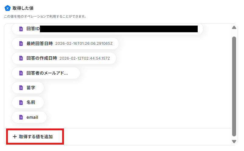 取得した値の下部にある、「+取得する値を追加」をクリックします。