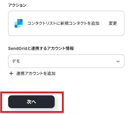 - 最後に、オペレーションでSendGridを選択し、「コンタクトリストに新規コンタクトを追加」アクションを設定し、トリガーで取得した情報をマッピングします