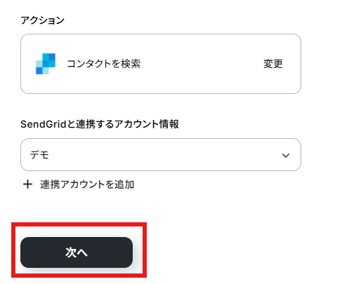 - 続けて、オペレーションでSendGridを選択し、「コンタクトを検索」アクションでフォームの回答情報をもとに既存コンタクトを検索します。
