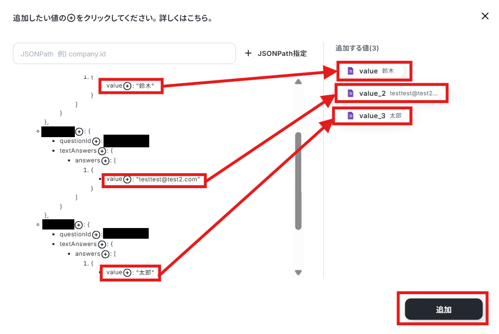 取得した値に追加したい値の「+」ボタンを押して追加ボタンを押します。